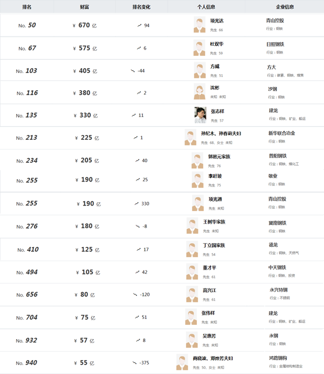 据统计,钢铁相关行业企业家上榜情况如下: