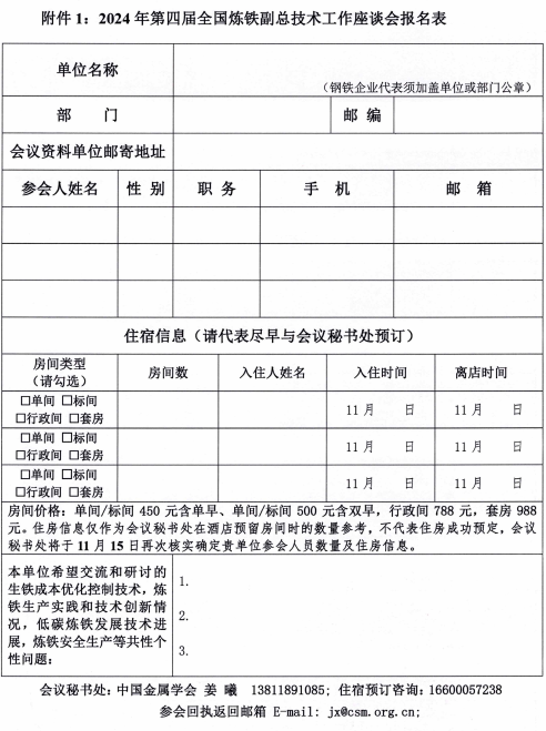本次工作会议免收钢铁生产企业代表会务费,代表交通费用自理。参会炼铁生产单位提交副总会大会主题报告、技术报告PPT,材料印刷截至日期为11月20日。
