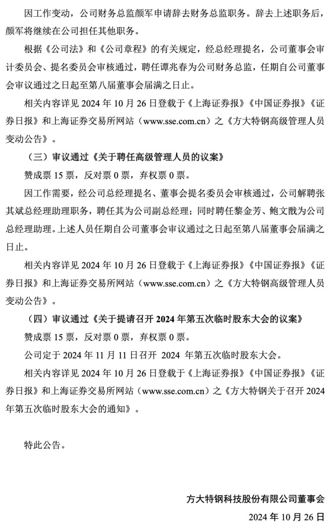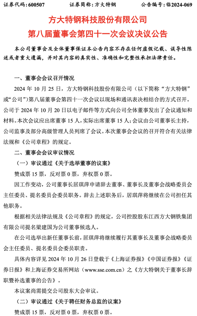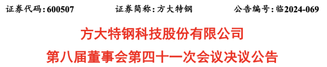 方大特钢科技股份有限公司(以下简称“公司”)10月25日晚间发布《第八届董事会第四十一次会议决议公告》(以下简称《公告》)。