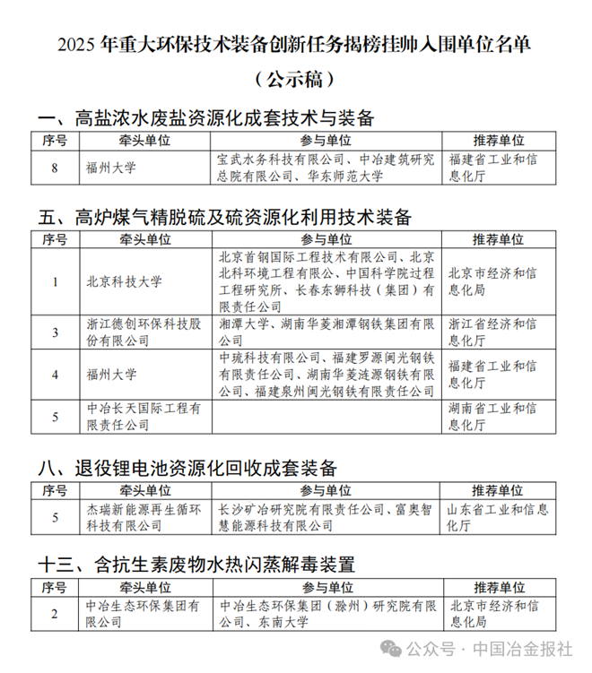 钢铁相关有这些!2025年重大环保技术装备创新任务揭榜挂帅入围单位名单公示