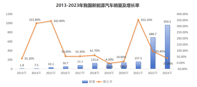 7、据中汽协数据显示:2023年新能源汽车持续快速增长,新能源汽车产销分别完成958.7万辆和949.5万辆,同比分别增长35.8%和37.9%,市场占有率达到31.6%,高于上年同期5.9个百分点,给电工钢市场需求带来了增量空间。不完全统计,2023年新能源汽车消耗高牌号无取向电工钢100-120万吨,特别是0.25mm、020mm等以及快速自粘结电工钢的需求开始增多。下图可看出,我国10年来新能源汽车销量及增长率的变化。