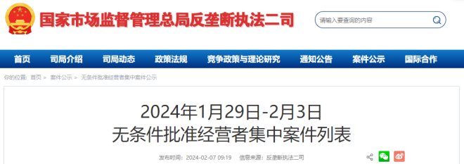 2024年2月7日,国家市场监督管理总局反垄断执法二司网站发布了《2024年1月29日-2月3日无条件批准经营者集中案件列表》。