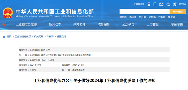 4月8日,工业和信息化部发布了《工业和信息化部办公厅关于做好2024年工业和信息化质量工作的通知》(以下简称“通知”)。