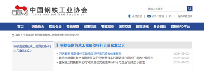 9月2日,宝钢湛江钢铁、首钢京唐钢铁、河钢石家庄钢铁(短流程电炉炼钢)极致能效工程能效标杆企业正式公示。前期经企业自评估,中国钢铁工业协会组织形式审查与书面评审,及组织专家对三家钢铁企业进行现场验收,已具备公示条件,已正式于钢协网站公示。