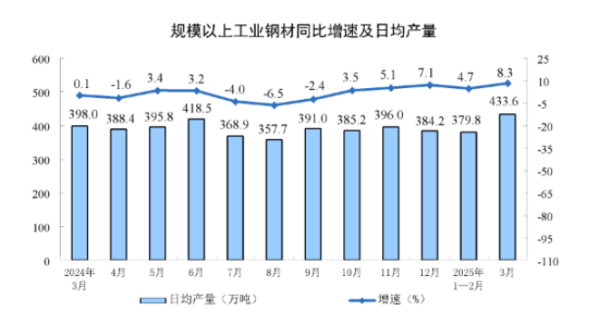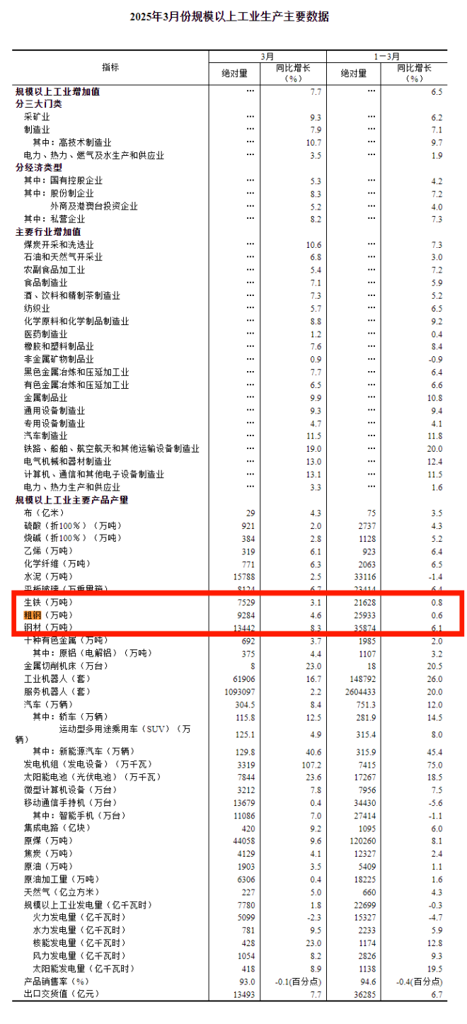 4月16日,国家统计局公布的数据显示,1-3月份,我国生铁产量21628万吨,同比增长0.8%;我国粗钢产量25933万吨,同比增长0.6%;我国钢材产量35874万吨,同比增长6.1%。