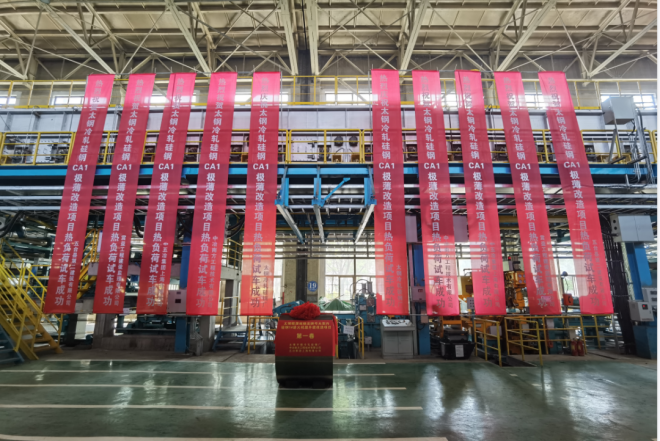 2022年6月30日上午10时18分,中国五冶集团工程总承包分公司承建的山西太钢冷轧硅钢厂极薄规格高牌号无取向硅钢项目CA1机组热负荷过钢一次性成功,标志着国内首条新建极薄规格高牌号无取向硅钢专业化生产线具备投运条件。