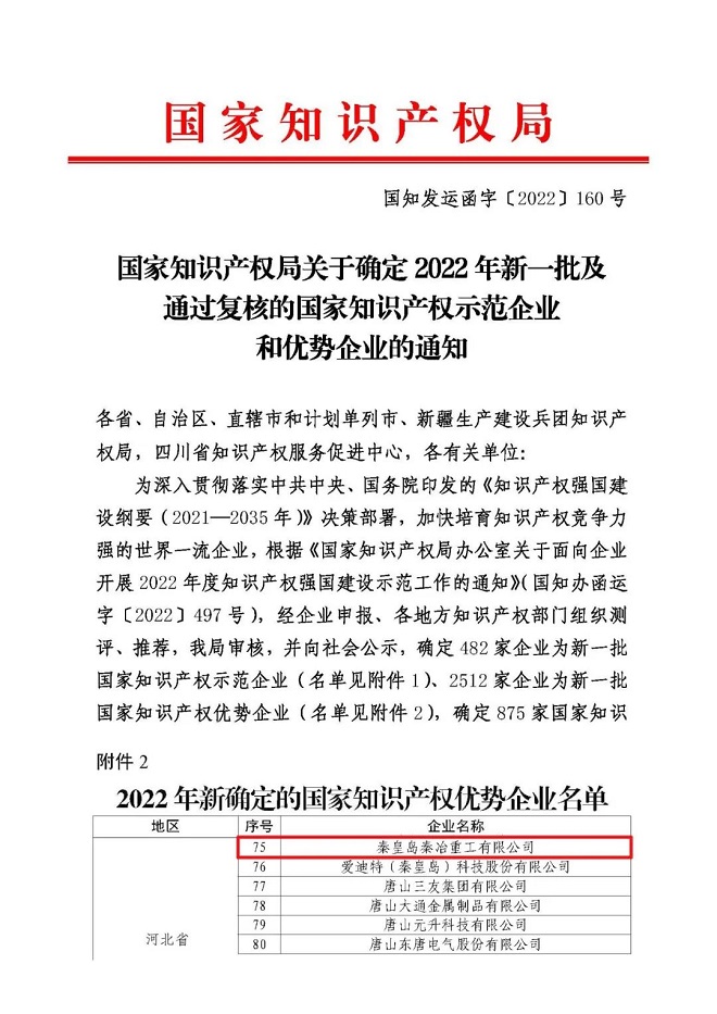 2022年10月31日,经国家知识产权局官网公示,秦冶重工顺利通过“国家知识产权优势企业和示范企业管理系统”审核,获得“国家知识产权优势企业”荣誉称号。