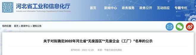 12月20日,河北省工信厅网站发布了《关于对拟确定2022年河北省“无废园区”“无废企业(工厂)”名单的公示》(以下简称《公示》)。