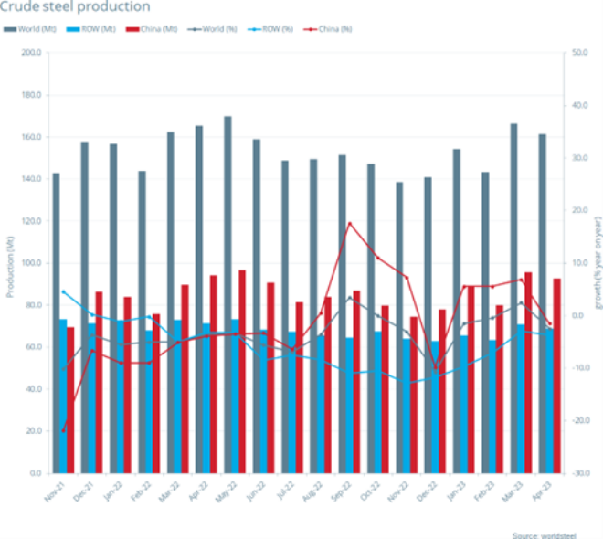 2023年4月全球63个纳入世界钢铁协会统计国家和地区的粗钢产量为1.614亿吨,同比下降2.4%。