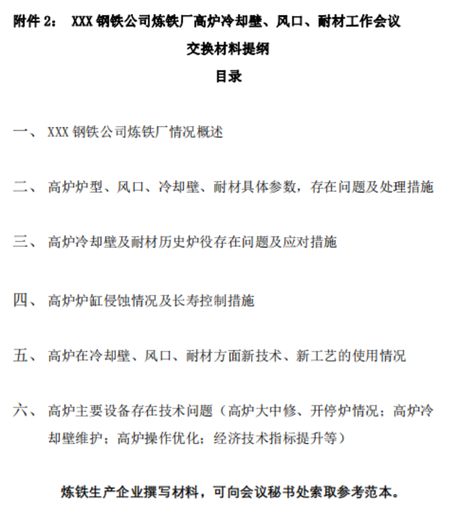 2. XXX钢铁公司炼铁厂高炉冷却壁、风口、耐材工作会议专题研讨交换材料提纲模板
