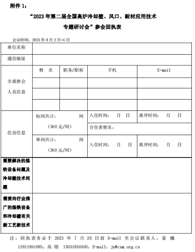 1.“2023年第二届全国高炉冷却壁、风口、耐材应用技术专题研讨会”参会回执表