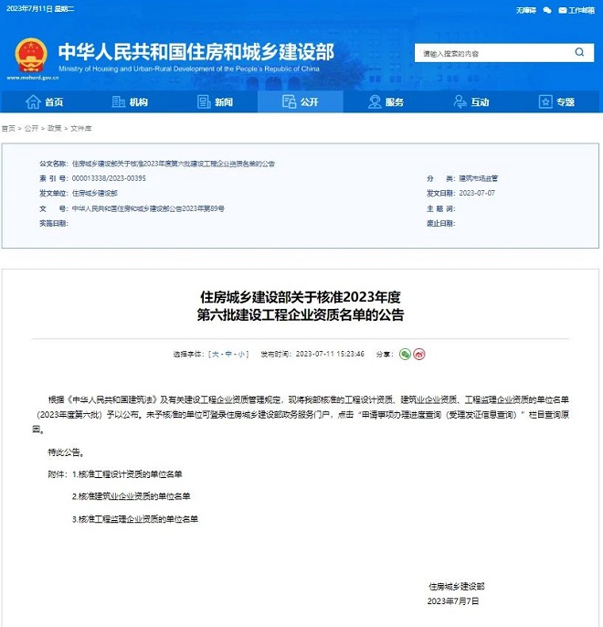 7月11日,国家住房和城乡建设部网站发布了《关于核准2023年度第六批建设工程企业资质名单的公告》(以下简称《公告》)。