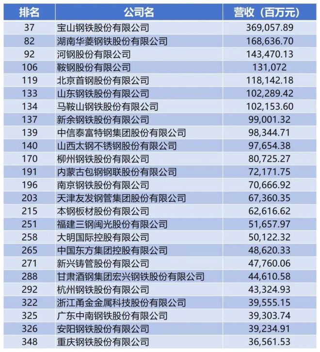 其中,宝山钢铁股份有限公司等25家钢铁企业上榜,具体排名如下: