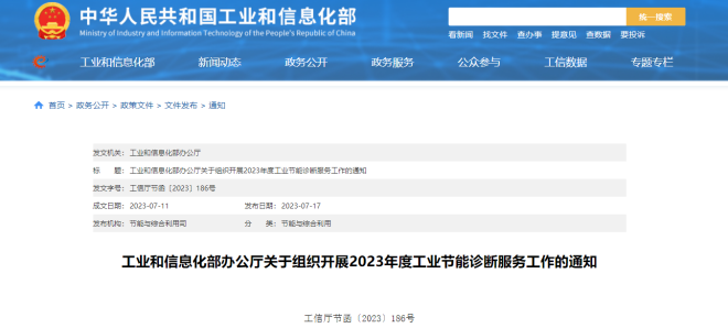 7月17日,工信部发布《关于组织开展2023年度工业节能诊断服务工作的通知》(以下简称《通知》)。