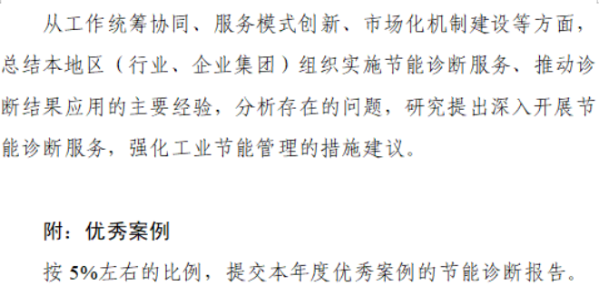 (三)开展工业节能诊断服务。中标工业节能诊断服务机构应按照工业企业和重点行业节能诊断服务指南等相关要求,确保高质量完成诊断任务,相关工作开展情况及诊断报告应及时报送推荐单位,并同步报送至工业节能诊断服务平台(www.gmpsp.org.cn)。承担全国工业节能诊断服务任务的机构不得就诊断服务向企业收取任何费用。
