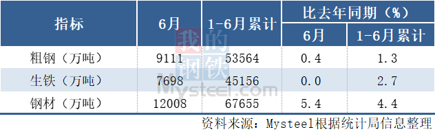 6月,中国粗钢产量9111万吨,同比增长0.4%;生铁产量7698万吨,同比持平;钢材产量12008万吨,同比增长5.4%。