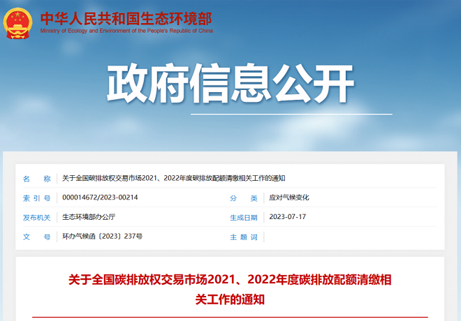 7月17日,生态环境部发布《关于全国碳排放权交易市场2021、2022年度碳排放配额清缴相关工作的通知》(以下简称《通知》)。
