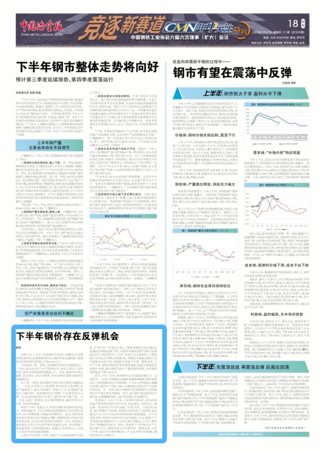 笔者预计,今年下半年,从政策环境来看,国内政策将重点聚焦维持宽松货币环境、稳定就业、恢复信心、推出新一批政策性开发性金融工具等方面。从流动性来看,海外通胀压力转弱,美国货币政策处于过渡期,加息接近终点,对大宗商品价格的影响将逐渐减弱。从产业角度来看,我国全年钢材需求或仍偏弱,不过,随着下半年稳增长政策继续发力,经济总量有望超过上半年,钢材需求下降幅度将收窄。同时,考虑到下半年钢企生产主要以减产为主,钢材供需关系有望好转。整体来看,今年下半年,海内外宏观预期较好,产业面矛盾有望缓解,钢材价格存在反弹机会。(韩娇)