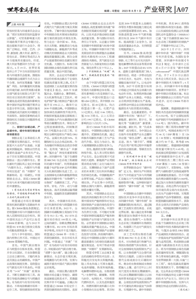 深圳碳中和在世界首创的基于负碳排放生态系统工程生物源中和技术路线的碳中和钢,与氢冶金绿色DRI钢铁产品减排技术路线相结合,进一步提高电炉短流程钢产品质量与适用范围,形成钢铁业碳减排与碳清除技术的完美组合,将为中国钢铁业绿色低碳高质量转型发展、增强国际竞争力带来绿色新机遇。中国作为世界钢铁第一大国,实施“三大工程”,绿色低碳高质量转型发展真抓实干,取得瞩目成就,完全具备应对欧盟CBAM外部市场挑战和定义碳中和钢的技术与产业实力,同时主导碳中和钢国际标准,发挥与大国地位相适应的国际话语权。