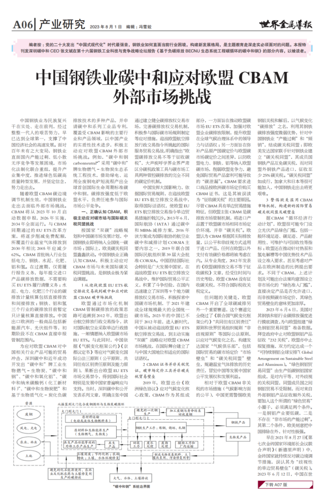 钢铁业是工业革命后人类文明繁荣发展的基石,中华民族复兴大业的产业基础,从富起来到强起来,钢铁业仍然是重要的基础产业和支柱产业。由于历史发展阶段原因,中国钢铁业一直以内循环为主,要在新时代国际风云变幻中构建“内循环为主,内循环与外循环相互促进”的“双循环”发展新格局,是一场硬仗。中国钢铁走出去,面临CBAM碳市场与未来可能的碳关税同盟的双重壁垒。