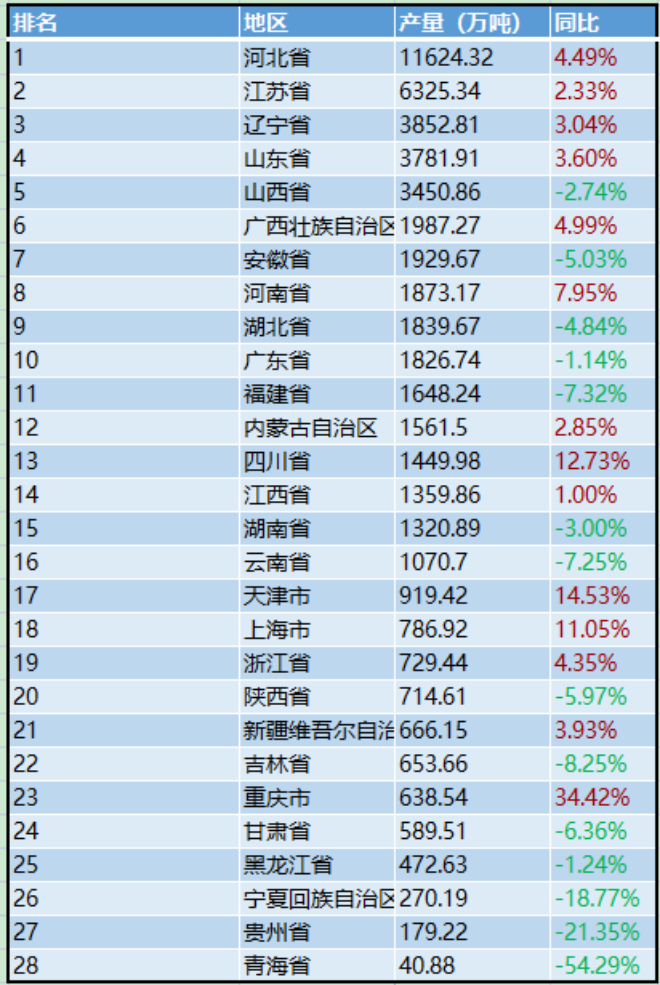 从分省数据来看,有4个省市1-6月粗钢产量同比增幅超过10%。其中四川增12.73%、天津增14.53%、上海增11.05%和重庆增34.42%。具体情况如下: