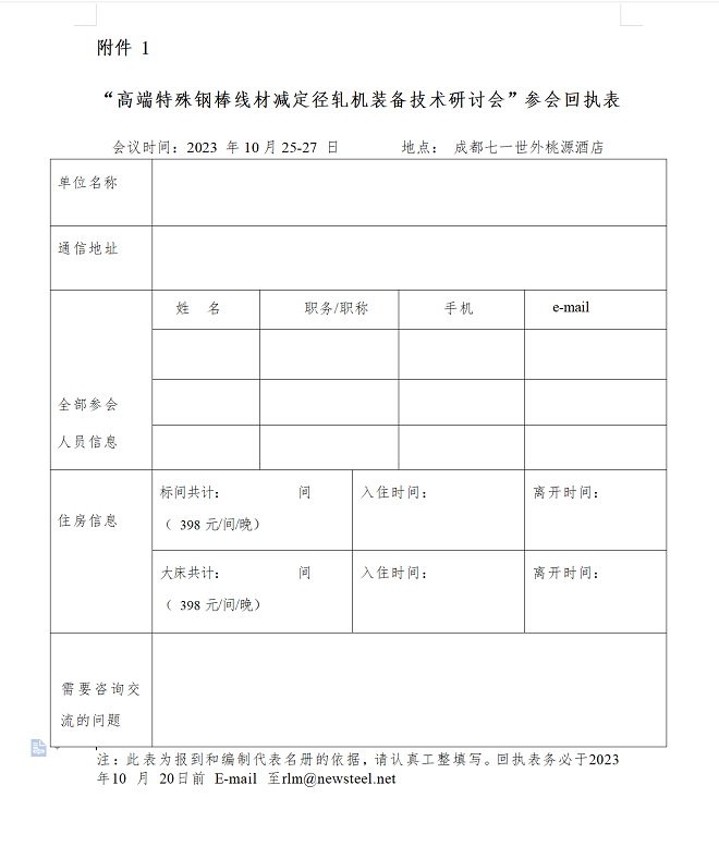 1、为准确落实参会人员数量,安排好代表的食宿及参观,请参加会议的代表务必于2023年10月20日前将“回执表”发至会议秘书处,E-mail:rlm@newsteel.net