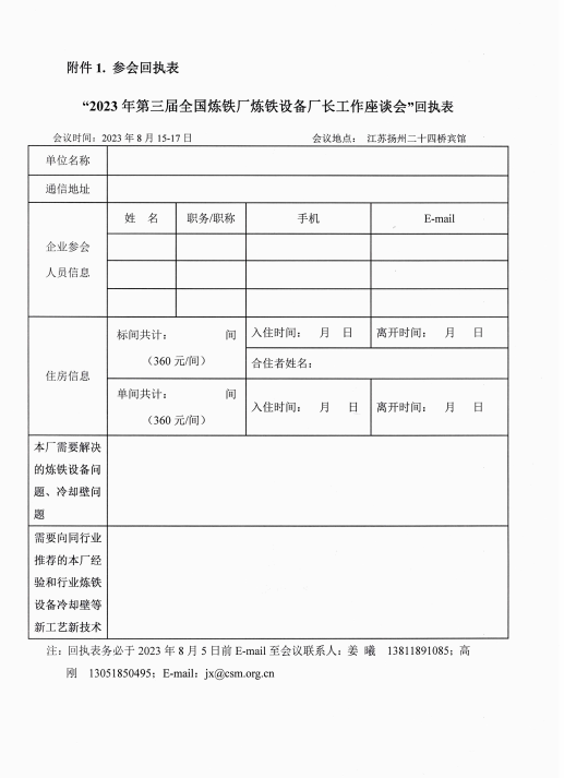 请相关高炉生产单位委派炼铁厂主管炼铁设备或相关技术负责人1-2人参会。