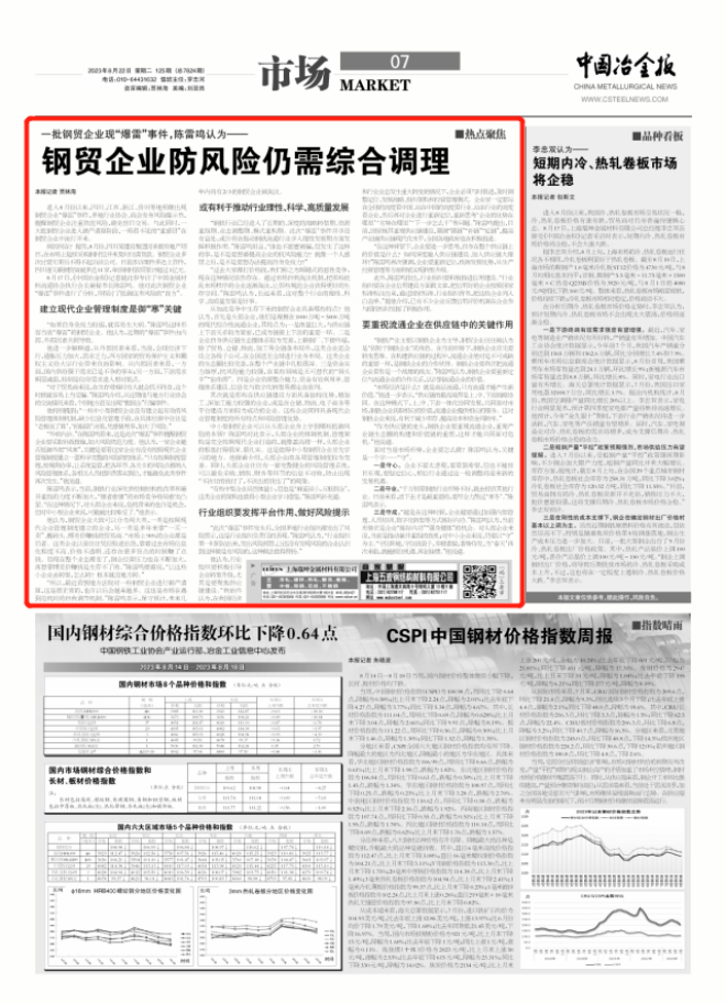 中小型钢贸企业可以从头部企业身上学到哪些抵御风险的本领?陈雷鸣对此表示,头部企业的体制机制、管理架构是完全按照现代企业打造的,就像盖高楼一样,头部企业的根基打得很深、很扎实。这是值得中小型钢贸企业首先学习的地方。他接着介绍,头部企业的各项管理制度较为完善。同时,头部企业往往有一套完整健全的风险管理系统,可以避免采购、销售、财务等环节的信息不对称,防止出现“不该付的钱付了,不该出的货出了”的现象。
