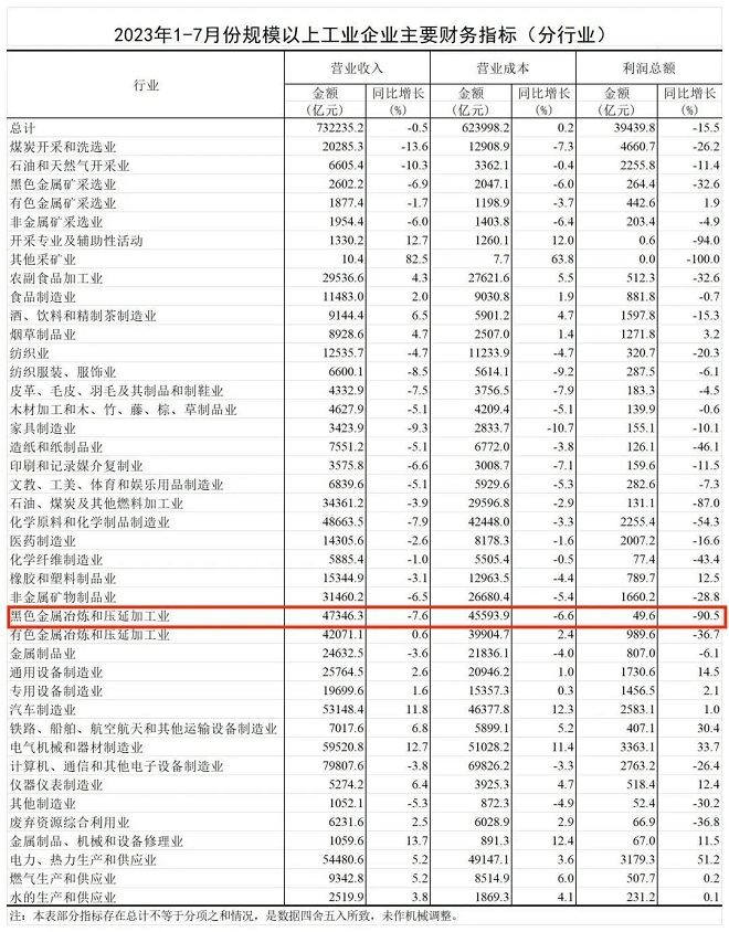 1—7月份,在41个工业大类行业中,13个行业利润总额同比增长,28个行业下降。主要行业利润情况如下:电力、热力生产和供应业利润总额同比增长51.2%,电气机械和器材制造业增长33.7%,通用设备制造业增长14.5%,专用设备制造业增长2.1%,汽车制造业增长1.0%,石油和天然气开采业下降11.4%,纺织业下降20.3%,煤炭开采和洗选业下降26.2%,计算机、通信和其他电子设备制造业下降26.4%,非金属矿物制品业下降28.8%,农副食品加工业下降32.6%,有色金属冶炼和压延加工业下降36.7%,化学原料和化学制品制造业下降54.3%,石油、煤炭及其他燃料加工业下降87.0%,黑色金属冶炼和压延加工业下降90.5%。