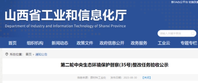 8月30日,山西省工业和信息化厅网站发布《第二轮中央生态环境保护督察(35号)整改任务验收公示》,涉及钢铁产能置换比例违规“放水”行为整改——